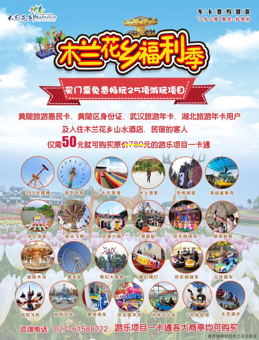 賞完花海,縱情游樂(lè ) 木蘭花鄉福利季震撼來(lái)襲 買(mǎi)門(mén)票免費暢玩25項游樂(lè )項目 黃陂惠民卡(身份證)、武漢賞花游惠民活動(dòng)預約用戶(hù)、湖北及大武漢年卡用戶(hù) 僅需50元,就可暢玩 價(jià)值780元的25項游樂(lè )項目