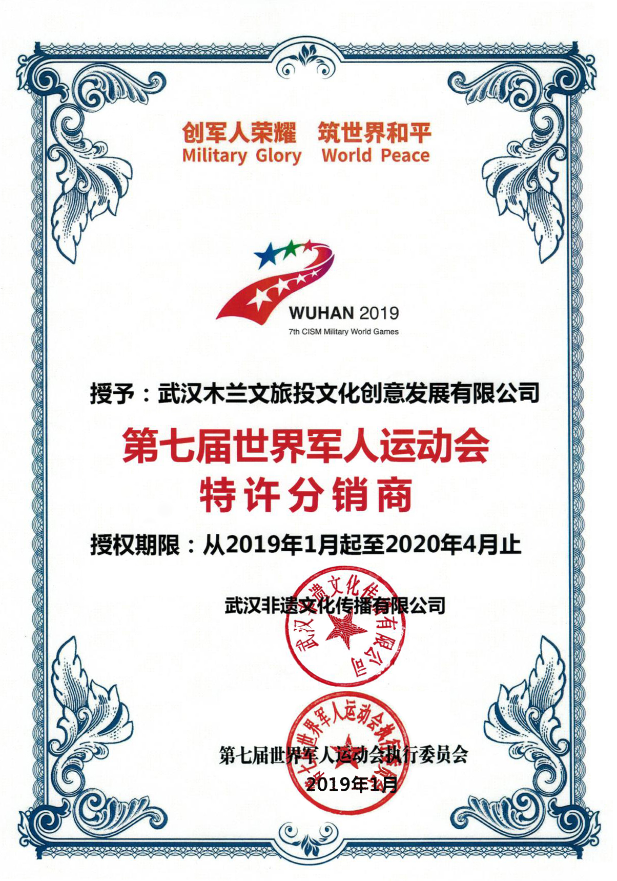 軍運會(huì )是世界盛會(huì ),更是黃陂幸事,自以軍運會(huì )吉祥物兵兵為主題的官方特許商品研發(fā)以來(lái),武漢木蘭文旅投文化創(chuàng )意發(fā)展有限公司極度關(guān)注,并積極參與,在黃陂區委區政府和黃陂區軍運會(huì )籌委會(huì )的大力支持下,憑借自身實(shí)力和優(yōu)勢,于2019年元月份被第七屆世界軍人運動(dòng)會(huì )執行委員會(huì )授予黃陂地區第七屆世界軍人運動(dòng)會(huì )特許分銷(xiāo)商,為黃陂區助力軍運,宣傳軍運及木蘭文化與軍運精神融合宣傳建立了更廣泛的營(yíng)銷(xiāo)渠道。